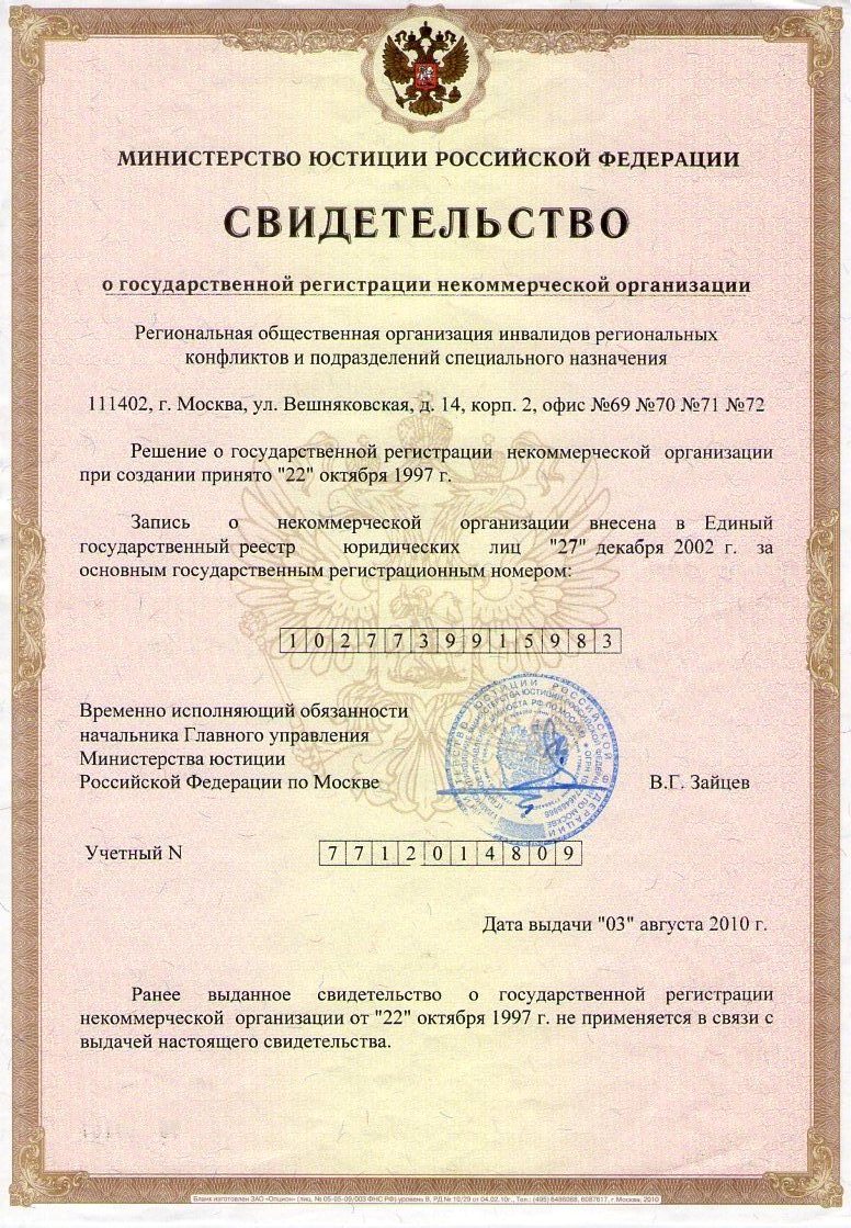 Руководящие документы и свидетельств о регистрации Региональной общественной организации инвалидов региональных конфликтов и подразделений специального назначения